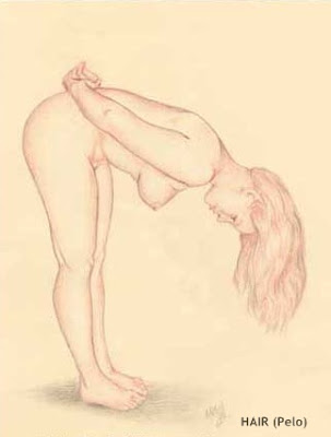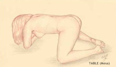 TABLE (Mesa): A cuatro patas y con su espalda recta, la kajira apoya las palmas de las manos en el suelo, totalmente perpendiculares a su cuerpo. El pelo se le aparta hacia el hombro izquierdo. De esta manera, puede servir de mesa o de reposa pies.