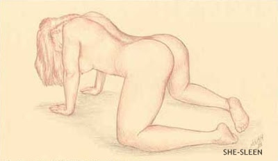 LESHA: La esclava permanece de rodillas apoyada en sus talones, con las manos en sus muslos. Mantiene una excelente postura con la espalda totalmente recta y los pechos erguidos. Las rodillas han de estar ámpliamente abiertas y las manos abiertas apoyadas en los muslos. La cabeza permanece alta, exhibiendo su collar. Esta posición la adquiere una esclava de placer.