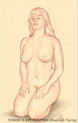 TOWER SLAVE POSITION (Posición Torre) : Es una variación de Nadu, en la que la esclava se arrodilla, pero las palmas de las manos están hacia abajo y sus rodillas permanecen modestamente juntas. Esta posición está, típicamente, reservado para esclavas de menos edad o adiestramiento, o simplemente para esclavas que no sirven de forma sexual a sus Señores.