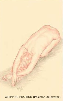 WHIPPING POSITION (Posición de azotar) : La esclava es desnudada para no estropear sus ropas. La posición inicial que adopta la esclava es la de Nadu, levanta los brazos, cruzándolos por encima de su cabeza e inclina su cuerpo hasta que la cabeza toca el suelo. El pelo es retirado hacia un lado, para que su espalda quede completamente expuesta al látigo. Una de sus variantes es poner las muñecas de la kajira por encima de su cabeza y encadenarla al techo. Las cadenas se elevan hasta que los tobillos de la esclava están a un cuarto de pulgada del suelo.