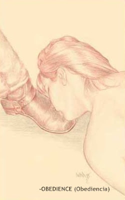 OBEDIENCE (Obediencia): Hay tres formas de mostrar obediencia al Señor. La primera es la posición de Nadu, pero con la cabeza agachada, mostrando sumisión al Señor. La segunda de ellas, arrodillada, la esclava acerca su cabeza al suelo, con las palmas de la mano en el suelo también, y suave y lentamente besa los pies de su Señor. La tercera forma de obediencia sería la postura de BELLY, tumbada sobre su vientre con los brazos a su lado, las piernas ampliamente abiertas y la frente apoyada en el suelo, la esclava debe ir reptando hacia los pies de su Señor y besarlos suavemente como en la posición anterior.