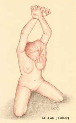 KO-LAR o COLLARING POSITION (Posición de poner collar) También llamada POSICIÓN DE SUMISIÓN FEMENINA. La esclava se arrodilla a los pies del Señor e inclina hacia detrás su cuerpo, sentada sobre sus talones con los brazos extendidos hacia arriba, cruzados por las muñecas. La cabeza permanece entre los brazos, agachada para suplicar.