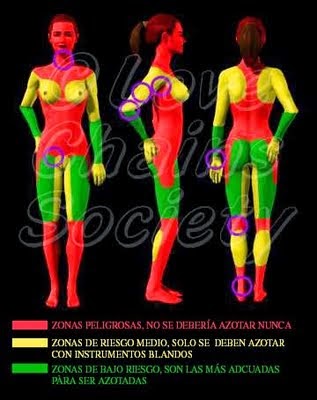 Como podemos observar, se encuentra marcada toda la anatomía del modelo humano, con diversos colores, que nos marcan, el nivel de peligrosidad que puede tener el azotar en algunas partes del cuerpo: